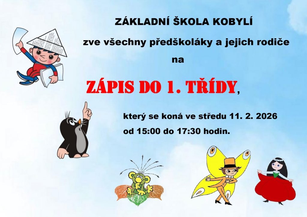 Zápis dětí do 1. ročníku základní školy pro školní rok 2026/2027 se bude konat v termínu – středa 11. 2. 2026 v době od 15.00 do 17.30 hodin v budově ZŠ Kobylí.